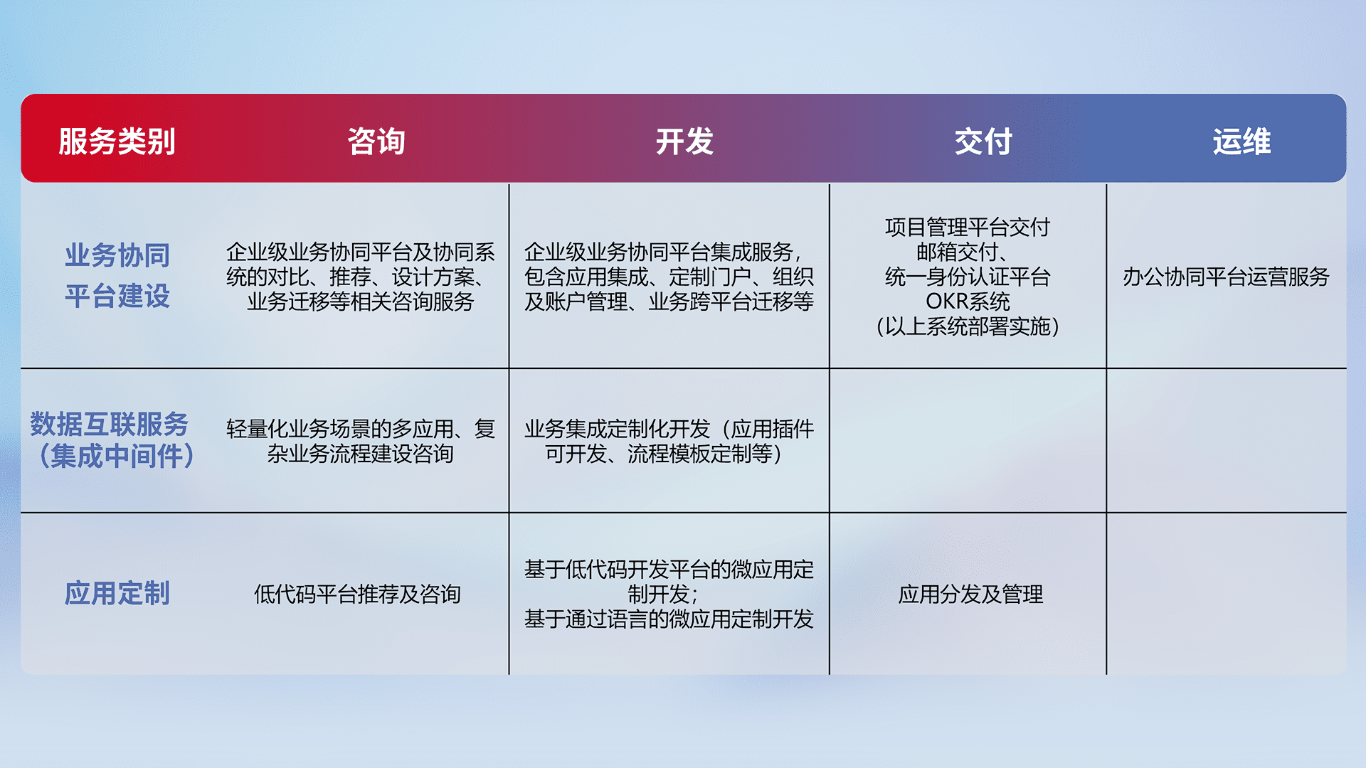 针对钉钉、、企微、、、、IDaas等平台级产品提供产品的规划、、、方案、、、、交付、、、、定制化开发等服务,,,,实现如统一协同办公、、、、智能客户服务、、、、混合会议管理、、智能数据查询、、、等业务场景,,,,实现数字化转型。。。